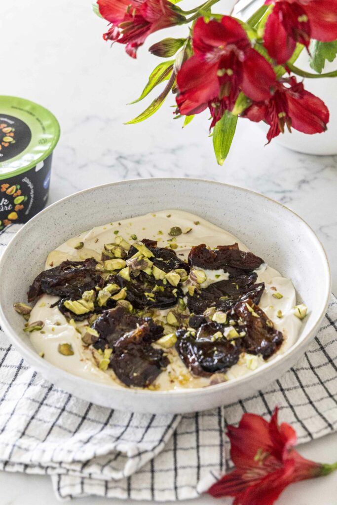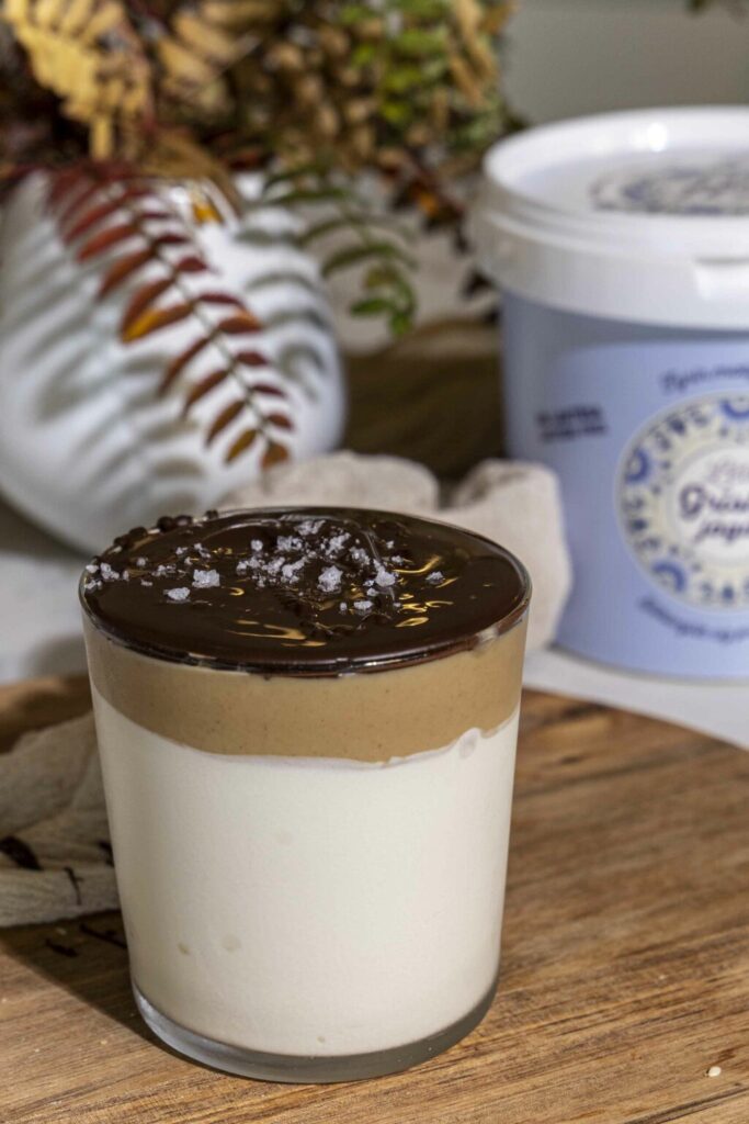 Próteinrík grísk jógúrt skál með hnetusmjörs og súkkulaðitoppi