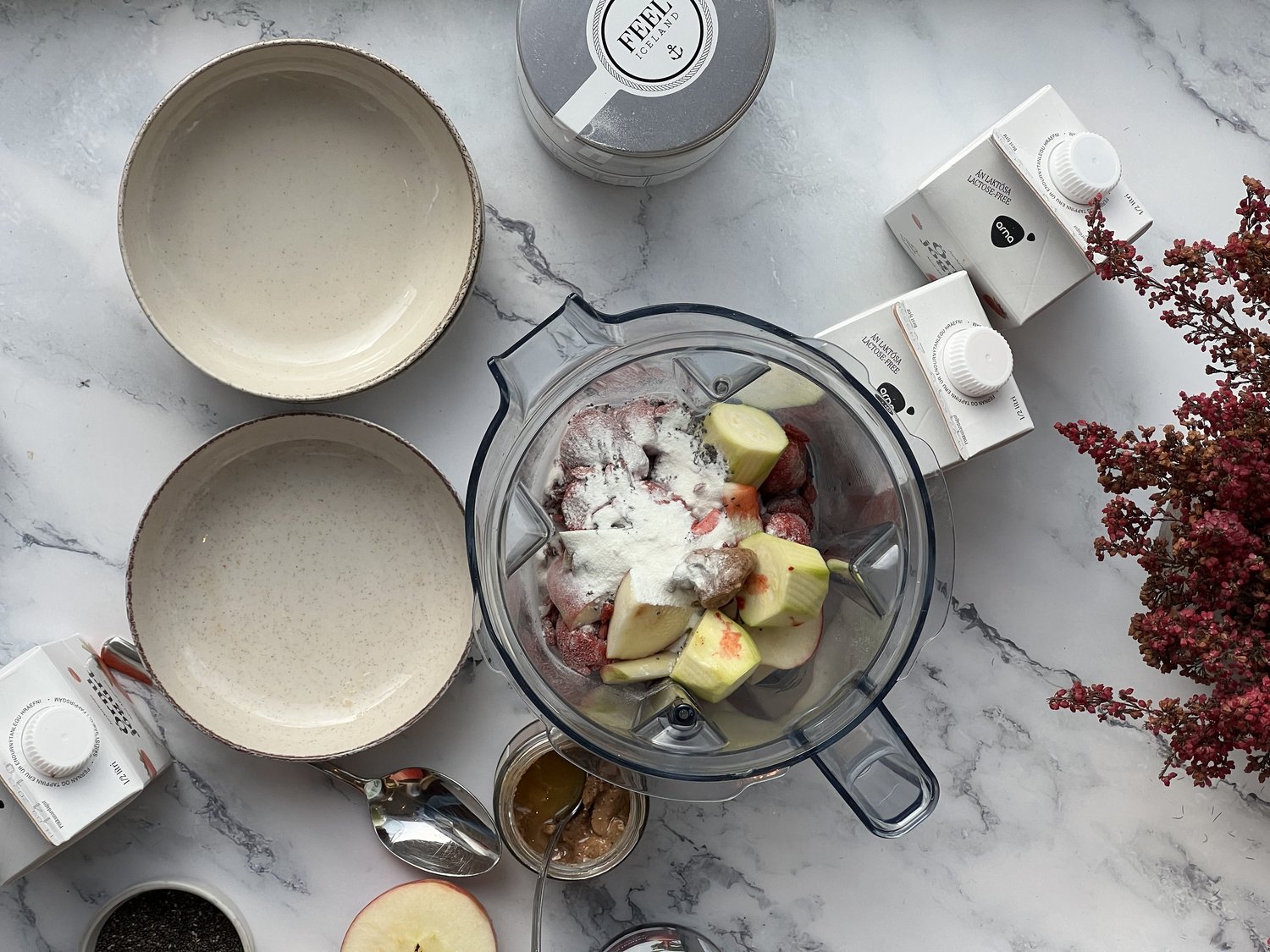 Blandið öllu nema haframjölinu í góðum blandara.