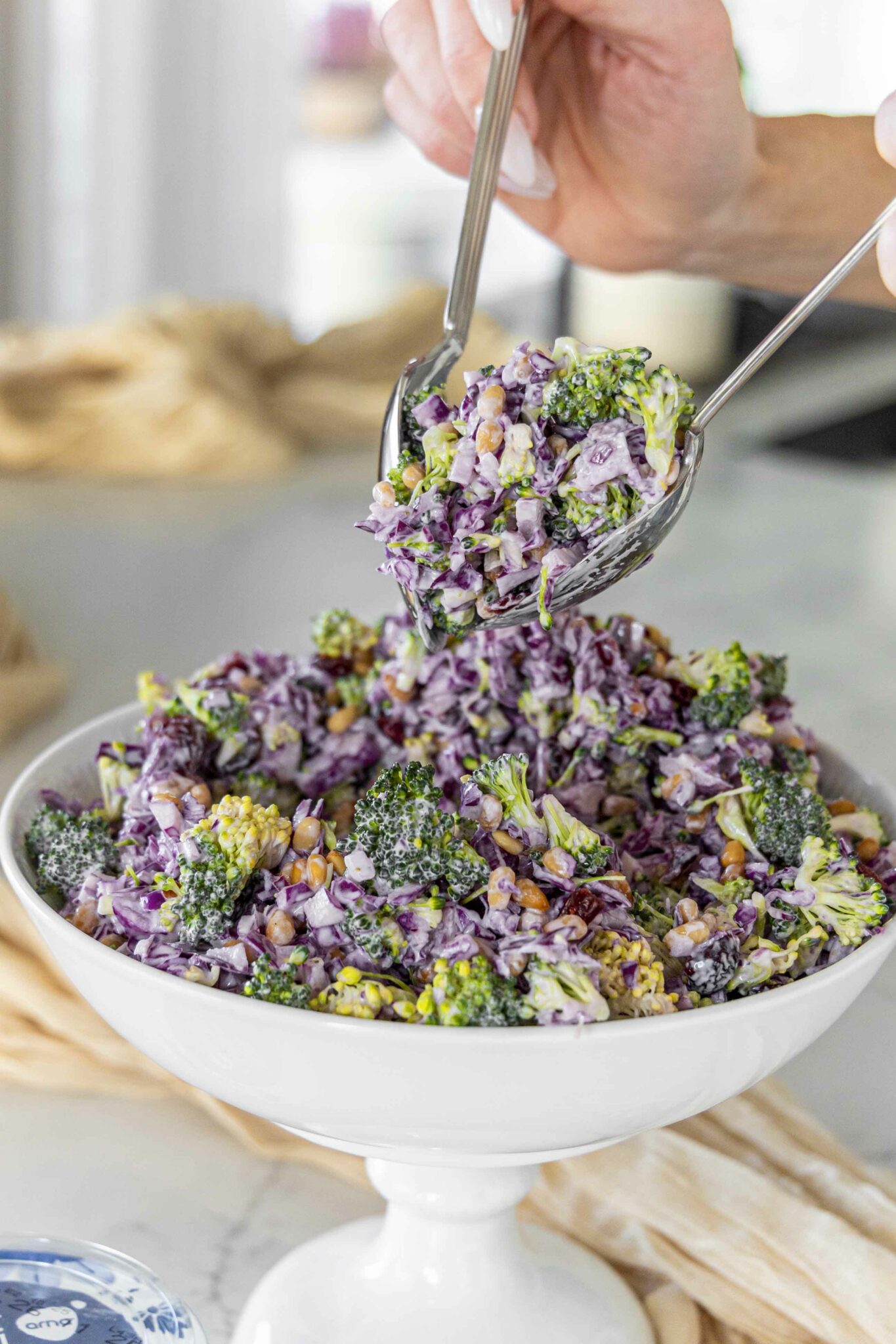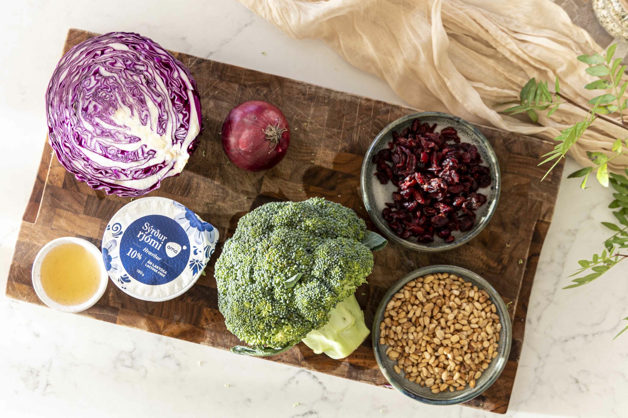 Þetta salat sameinar stökk brokkolíblóm, fínsaxað rauðkál, sætu frá trönuberjum og milda hnetukeim úr ristuðum furuhnétum. Sósan er silkimjúk blanda af sýrðum rjóma og mæjónesi, sem umlykur grænmetið án þess að gera það þungt.