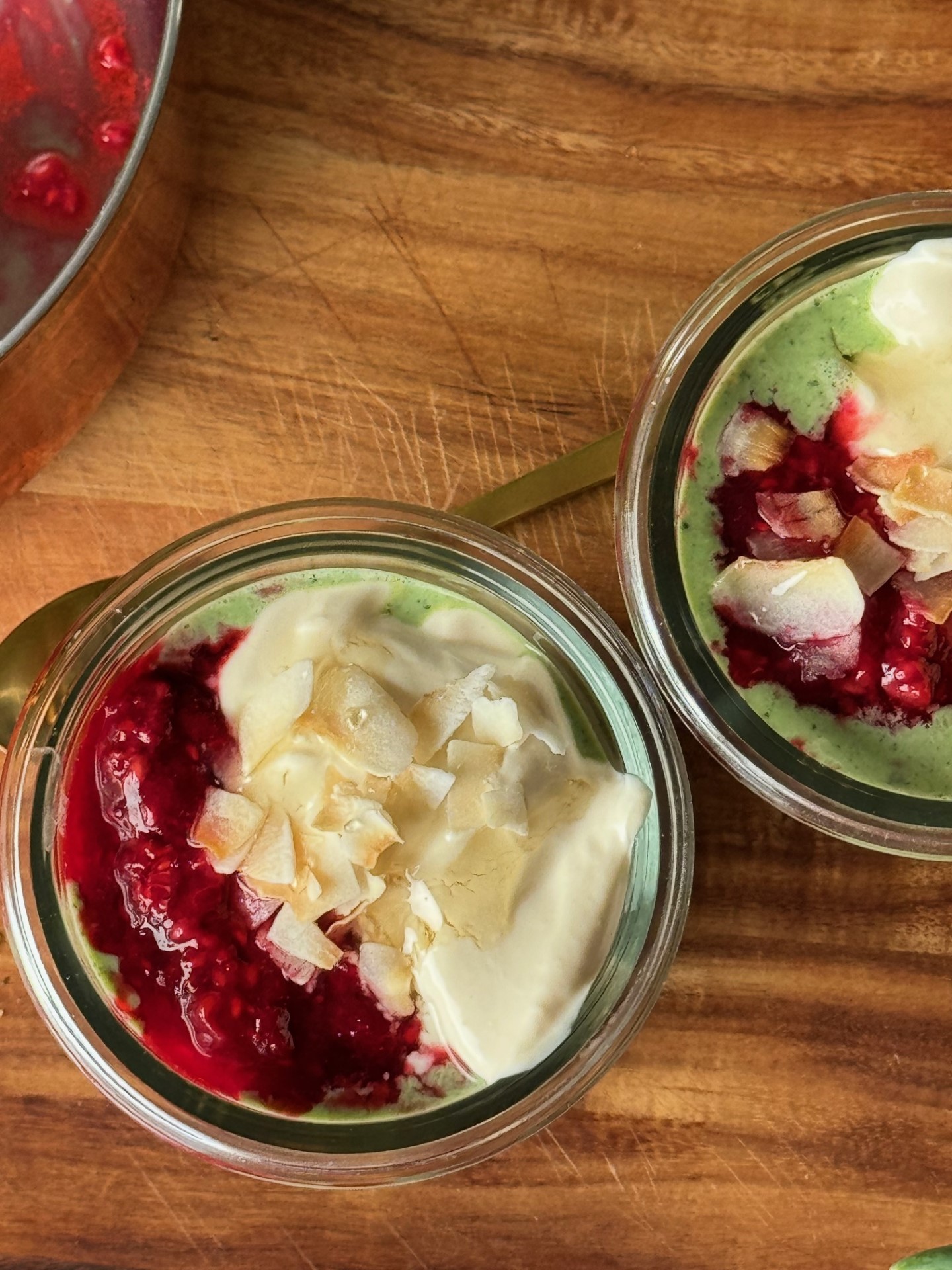 Hellið matcha-höfrunum í krukku og bætið hindberja “sultunni” ofan á og meiri grískri jógúrt. Látið liggja í ísskápnum yfir nótt og bætið ristuðum kókosflögum og njótiði.